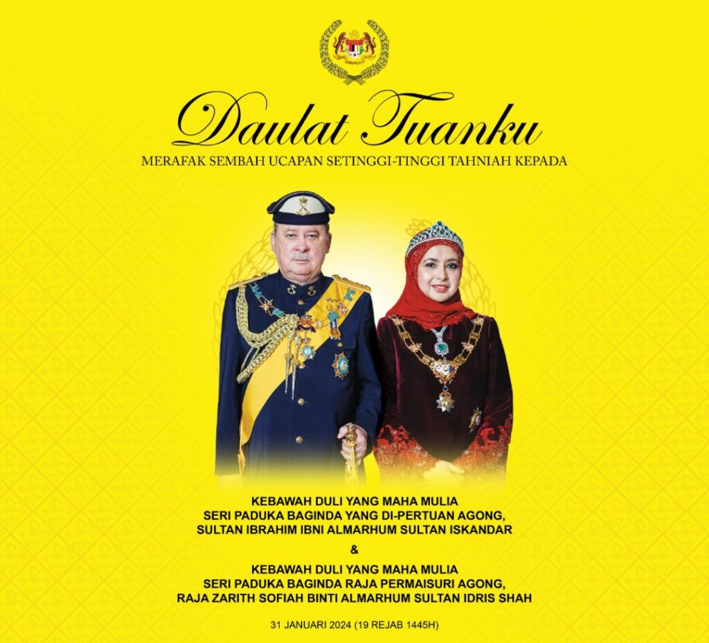 Kebawah Duli Yang Maha Mulia Seri Paduka Baginda Yang di-Pertuan Agong Sultan Ibrahim Ibni Almarhum Sultan Iskandar dan Kebawah Duli Yang Maha Mulia Seri Paduka Baginda Raja Permaisuri Agong Raja Zarith Sofiah Bini Almarhum Sultan Idris Shah, Sempena Istiadat Mengangkat Sumpah Seri Paduka Baginda Tuanku Sebagai Yang di-Pertuan Agong XVII.
